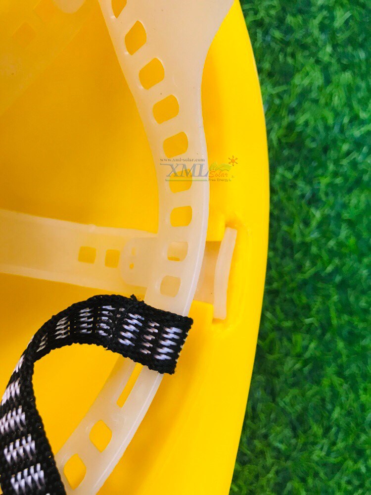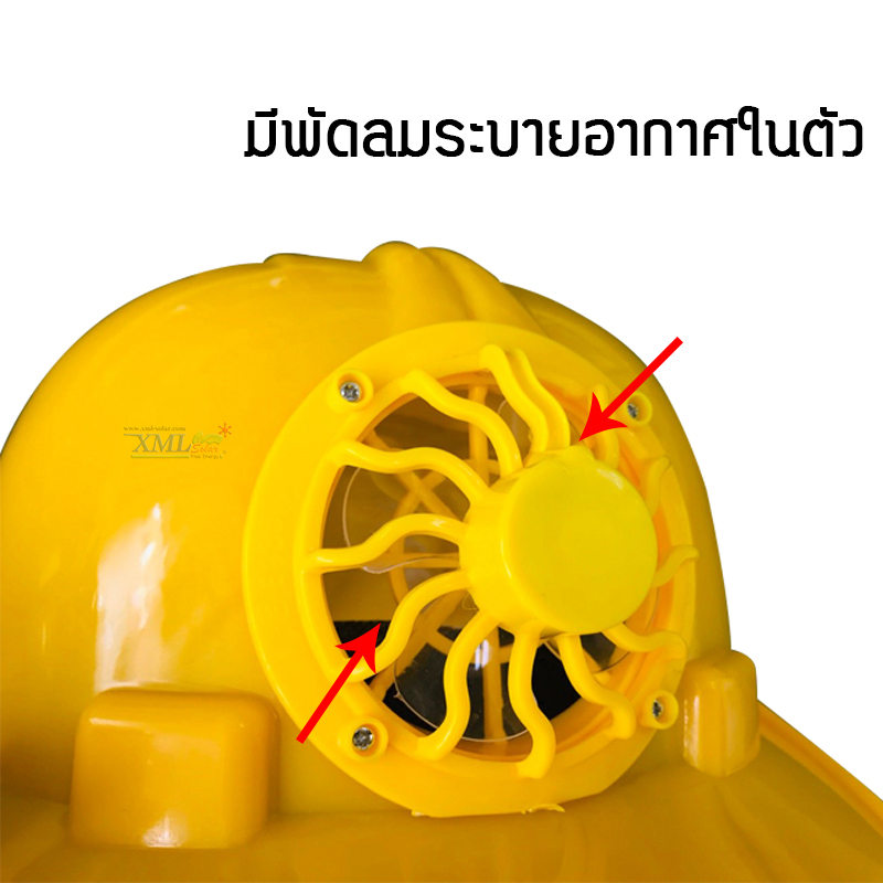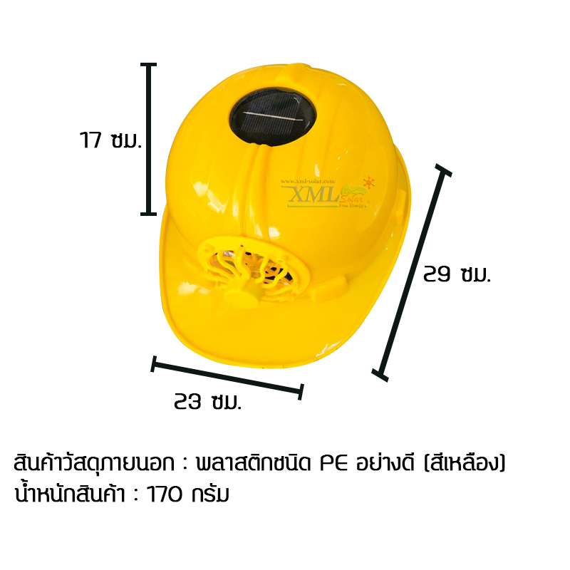 - - เป็นหมวกเซฟตี้ ได้มาตรฐานการใช้งานมีเบ้ายึดศรีษะและสายรัดคาง โดยมีพัดลมขนาดเล็กอยู่ด้านหน้าของหมวกโดยใช้พลังงานจากโซล่าเซลล์ (Solar cell) บนหมวก โดยตรง