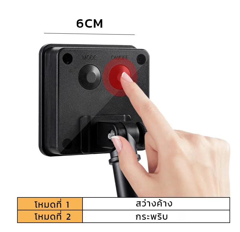 - เปิดสวิตส์ทำงานโดย กดปุ่มสีดำ ด้านหลังแผงรับพลังงานโซล่าเซลล์ เพื่อเปิดสวิตส์เริ่มการทำงาน (ควรนำแผงโซล่าเซลล์ไปตากแดดเพื่อรับพลังงานแสงอาทิตย์ก่อน การใช้งานครั้งแรก อย่างน้อย 8 ชม. )