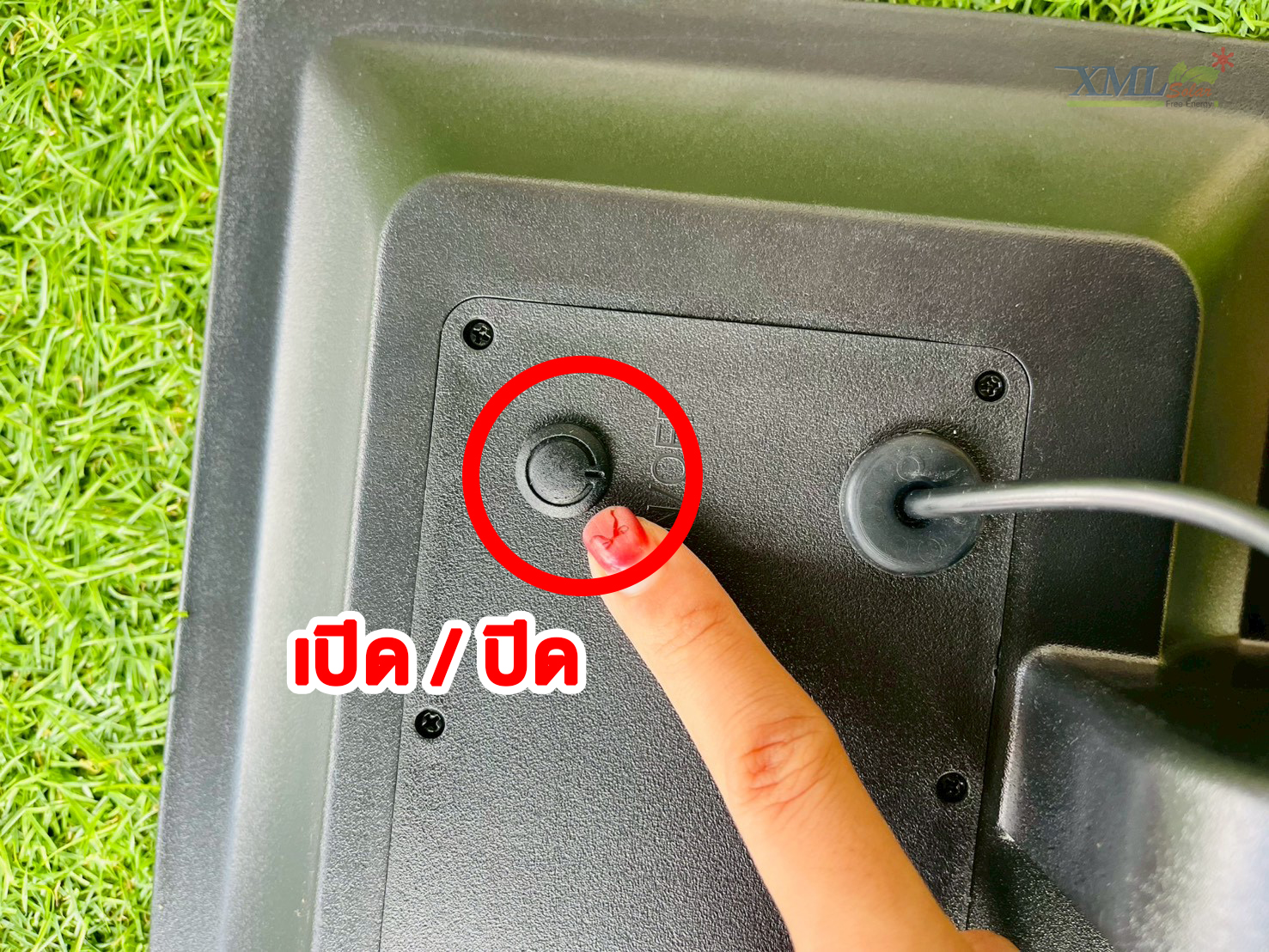 - เปิดสวิตส์ทำงานโดย กดปุ่มที่หลังแผงโซล่าเซลล์ เพื่อเปิดสวิตส์เริ่มการทำงาน