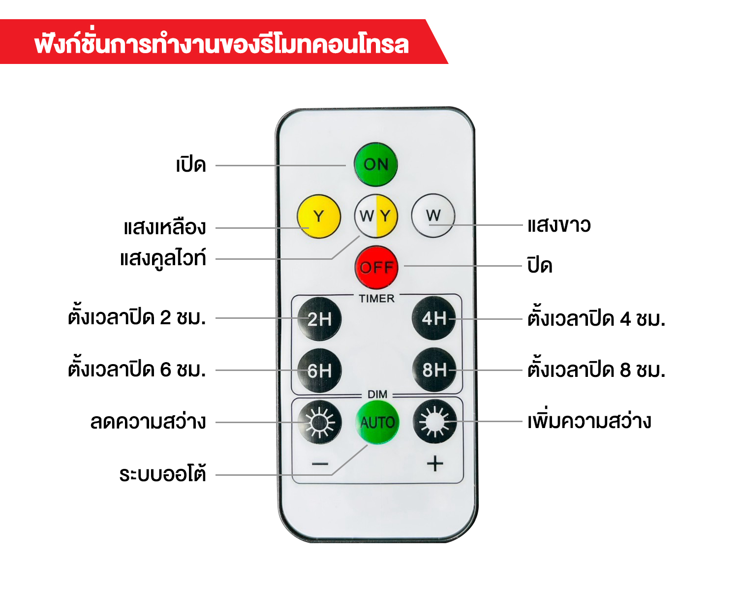 วิธีใช้ : - เปิดสวิตส์ทำงานโดย กดปุ่มที่ตัวรีโมท ไฟจะเริ่มการทำงานอัตโนมัติ ทุกวัน